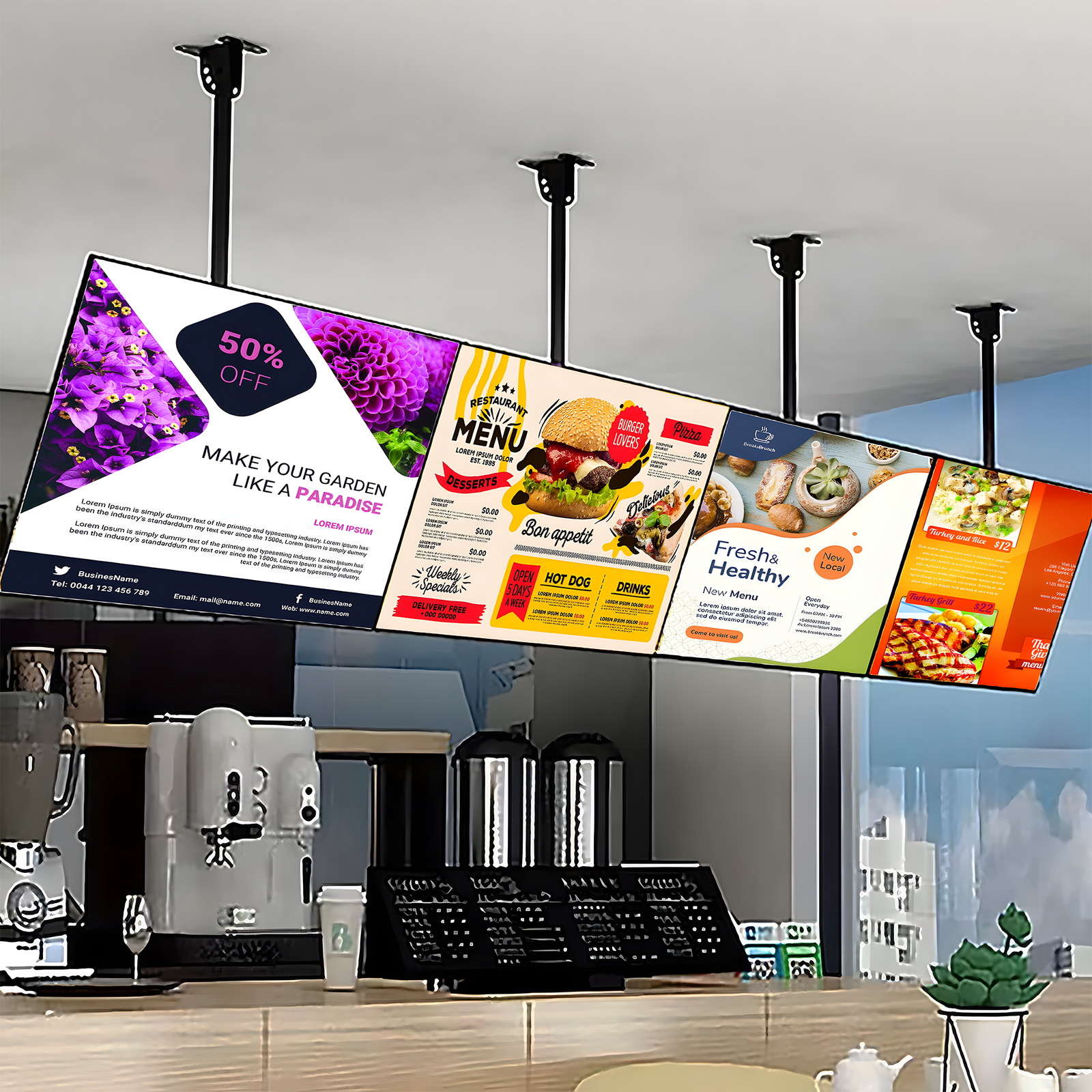 - Su diseño moderno con marco negro elegante y estructura de aluminio resistente permite integrarlo fácilmente en cualquier tipo de establecimiento, desde tiendas y restaurantes hasta oficinas, barberías o centros comerciales.